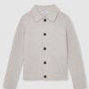 V-stitch cable knitting through the front of the Gideon cardigan lends artisanal appeal. A classic collar offers soft structure to the neckline, while subtly branded buttons add a signature finish. 100% wool. V-stitch cable knit. Classic collar. Front buttons.