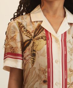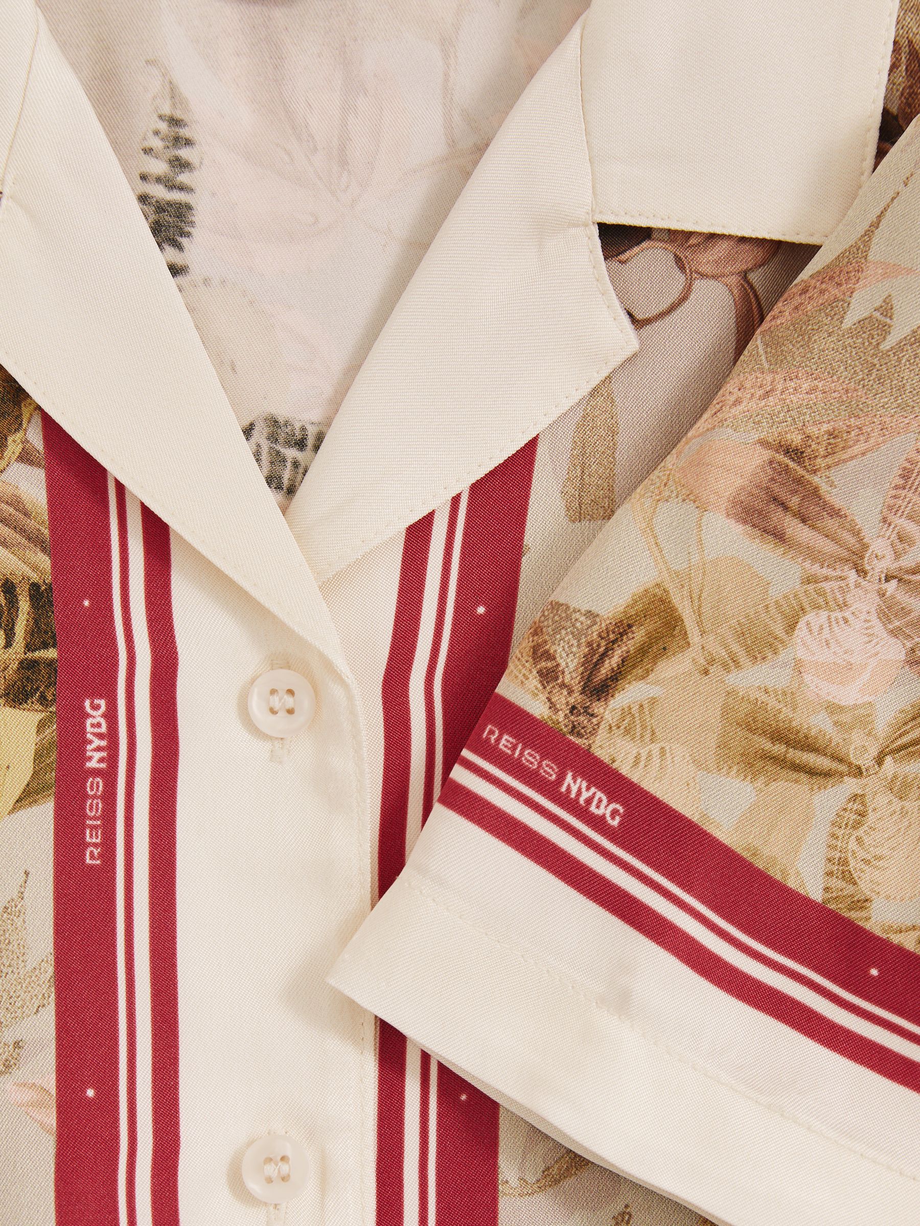 A tropical floral print, inspired by the New York Botanical Garden’s rare book collection, decorates the Santana shirt, offering a unique, camouflage-like effect. The satin fabrication and relaxed cut enhance fluidity, while a contrasting brand stripe neatly frames the style. Satin Botanical floral print Brand stripe Cuban collar Short sleeves Side notches at hem French button placket The Reiss x NYBG collection blends nature’s beauty with modern design, inspired by the New York Botanical Garden’s rare book collection. Featuring a mix of new and signature styles, it reimagines archival illustrations through a contemporary lens, with floral prints and bold colours that capture both botanical artistry and the city’s vibrant energy. This collection supports NYBG’s work in global plant research and conservation, horticulture, and education.