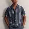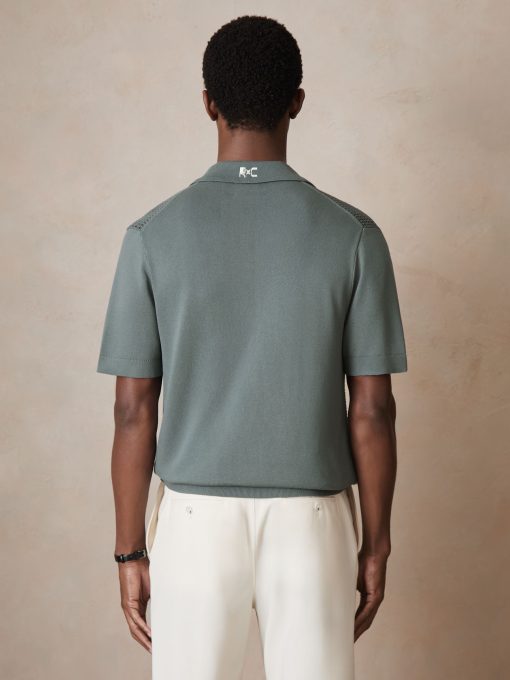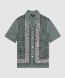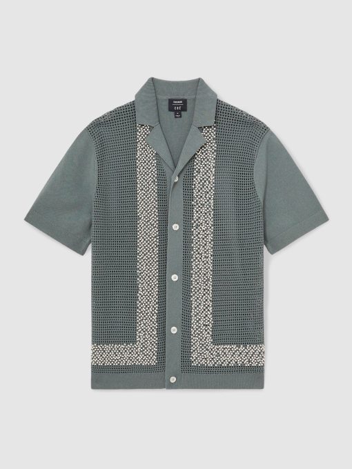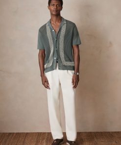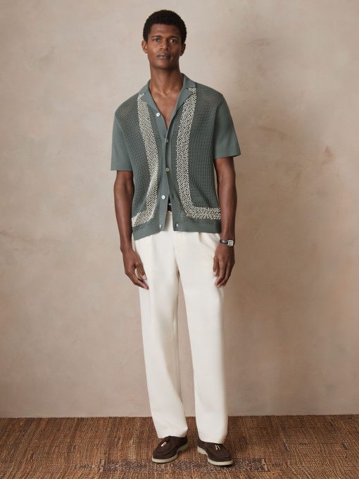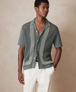 Crocheted front panels embellished with contrasting beads give the Sage Accra shirt a distinctive, tactile finish. Crafted from a compact knit, it’s elevated by a Cuban collar and finished with an embroidered ‘R x C’ logo at the back. Crochet panels Bead embellishment Embroidered logo at collar reverse Cuban collar Front buttons Reiss x Ché unites refined resortwear with everyday versatility. Signature motifs, vibrant prints, and textured finishes bring character to a modern, transitional collection – defined by sleek design, laid-back tailoring, and effortless impact. The model is wearing a size M. Measurements of model: 6ft 2.5″ / 189cm.