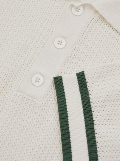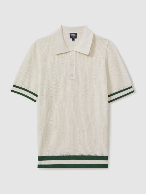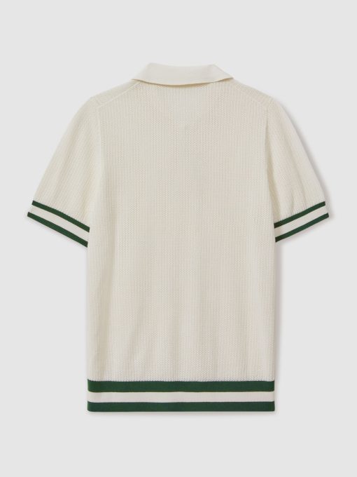 Crafted from cotton in an airy open-stitch design, the white Quinn polo shirt is perfect for the warmer months. Contrast trims feature to the waistband and cuffs, cinching the style. 100% cotton Open-stitch construction Branded pearlised buttons Half-button polo neckline Contrast trim detailing Season 3 of the Reiss, Ché collaboration offers elevated resort styling, playfully inspired by 1950s ice cream and advertising signage. Encapsulating a vacation state of mind, each piece offers versatility, a laid-back attitude and vivid confidence. The model is wearing a size M. Measurements of model: 6ft / 183cm.