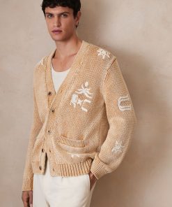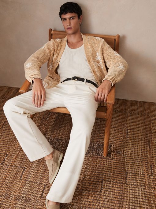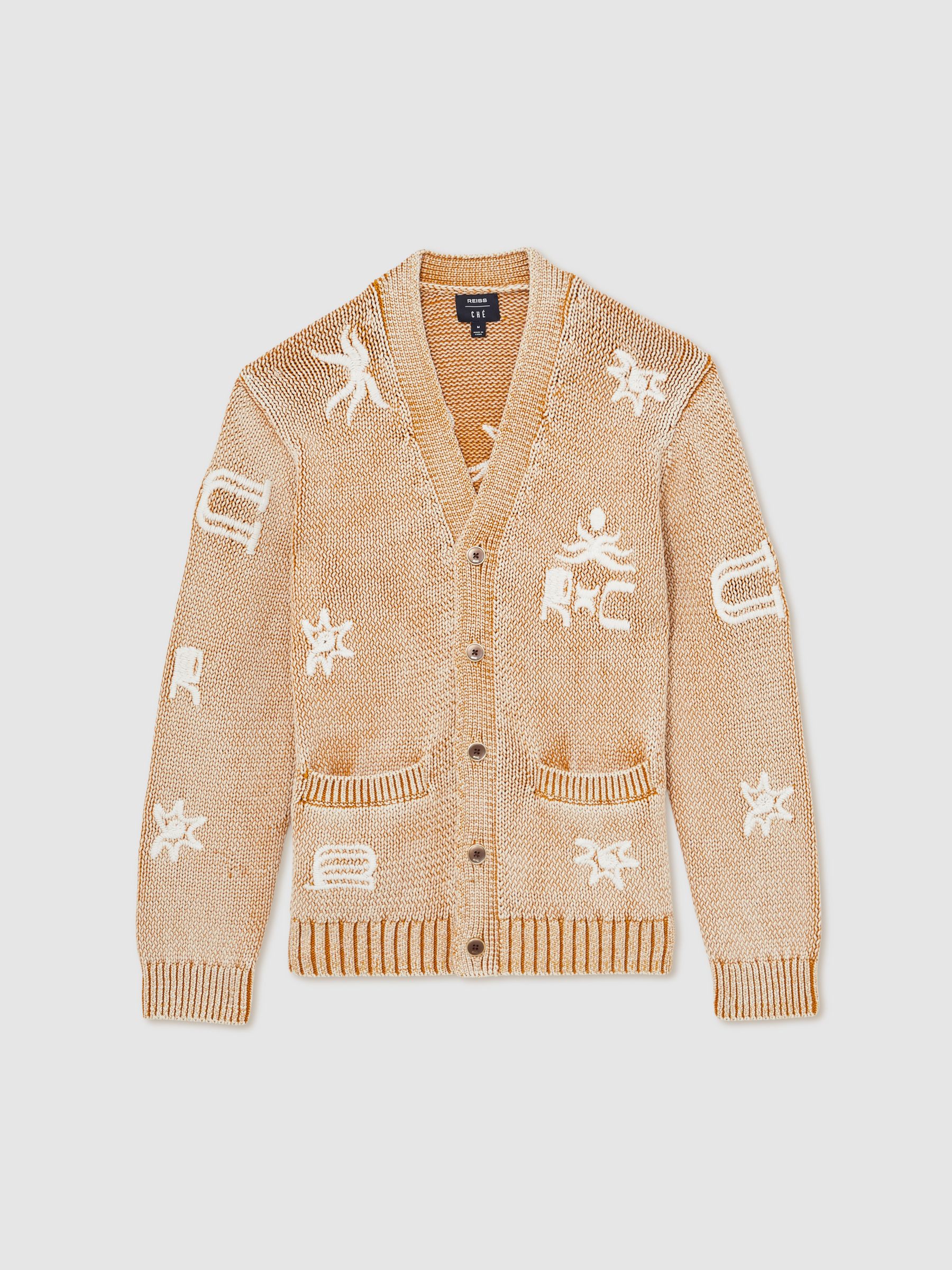 Knitted from a soft cotton-blend with a washed finish, the Verra cardigan is elevated by embroidered brand motifs for a distinctive touch. Chunky rib-knit trims add structure to the hem and cuffs. Cotton-blend knit Washed finish Motif embroidery Rib-knit trims Front buttons Reiss x Ché unites refined resortwear with everyday versatility. Signature motifs, vibrant prints, and textured finishes bring character to a modern, transitional collection – defined by sleek design, laid-back tailoring, and effortless impact. The model is wearing a size M. Measurements of model: 6ft 2″ / 188cm.