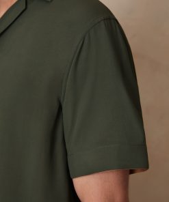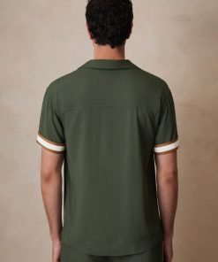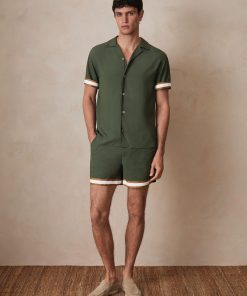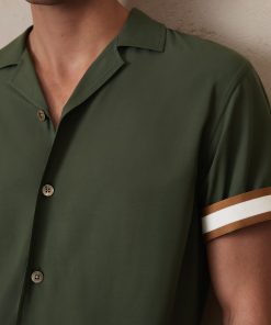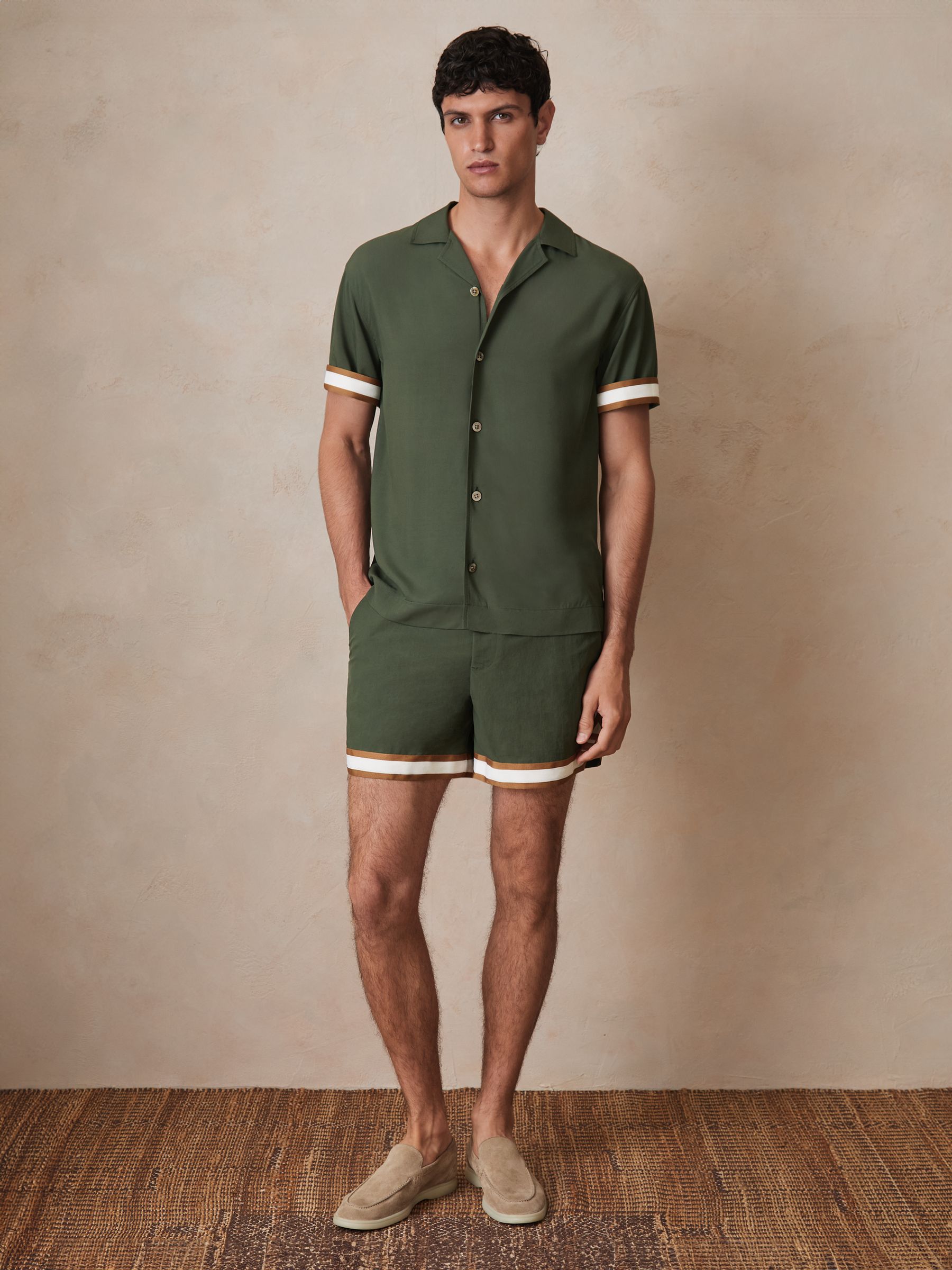 The Pine Green Valbonne shirt is crafted from an ultra-soft, lightweight cotton-blend fabric, ideal for warm-weather getaways. Turned-up cuffs reveal a contrasting striped trim, while subtle branding on the front buttons adds a signature finish. Crafted with cotton Striped turn-up cuffs Cuban collar Front buttons Reiss x Ché unites refined resortwear with everyday versatility. Signature motifs, vibrant prints, and textured finishes bring character to a modern, transitional collection – defined by sleek design, laid-back tailoring, and effortless impact. The model is wearing a size M. Measurements of model: 6ft 2″ / 188cm.