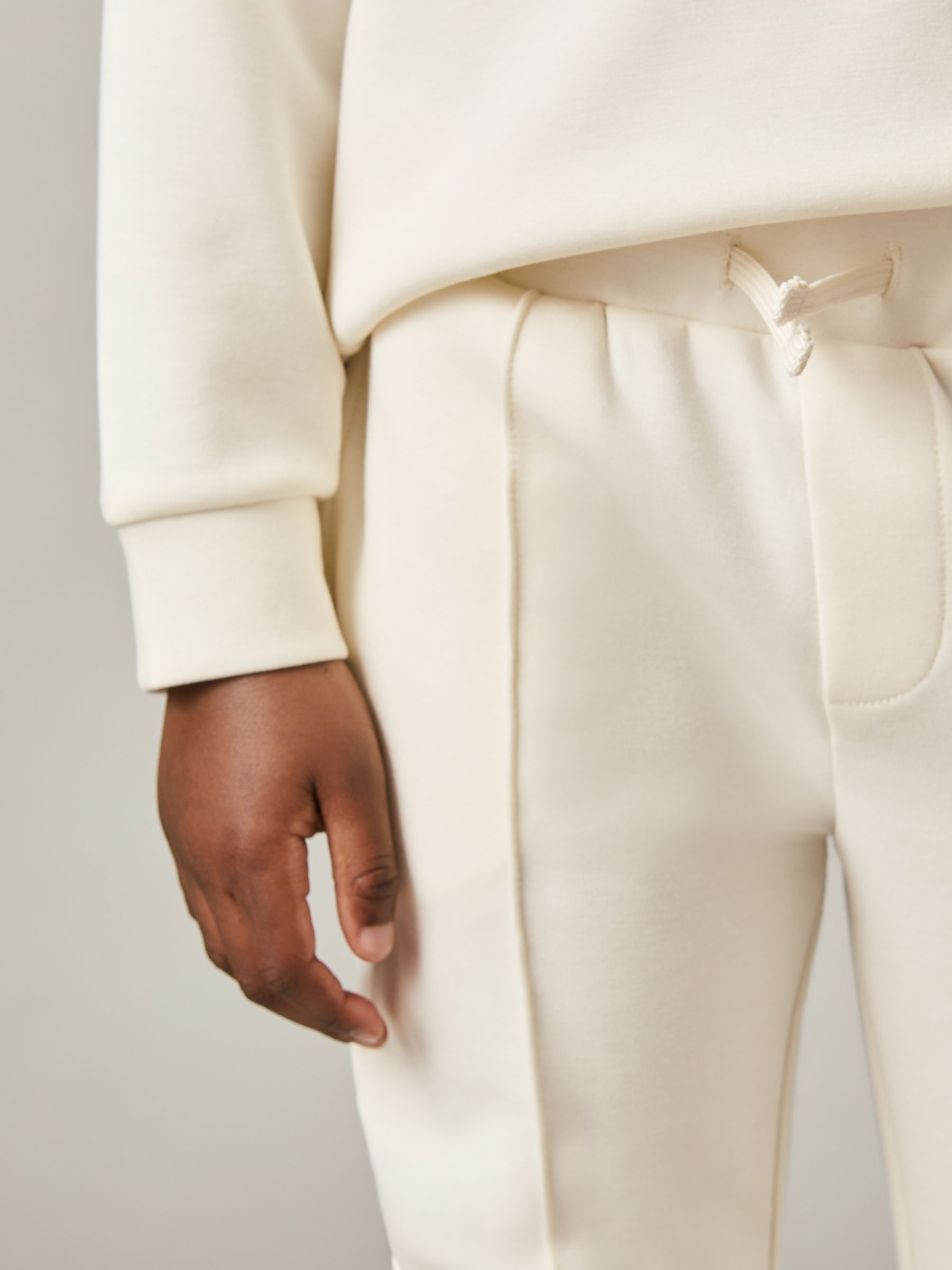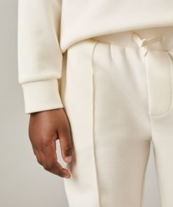 The Off White Premier joggers are a refined take on casual wear. Crafted from smooth interlock jersey, they feature sharp pintucks for a tailored edge. An elasticated drawstring waist and cuffs combine comfort with modern style. Interlock jersey Pintucks Elasticated drawstring waist Side slit pockets Elasticated cuffs