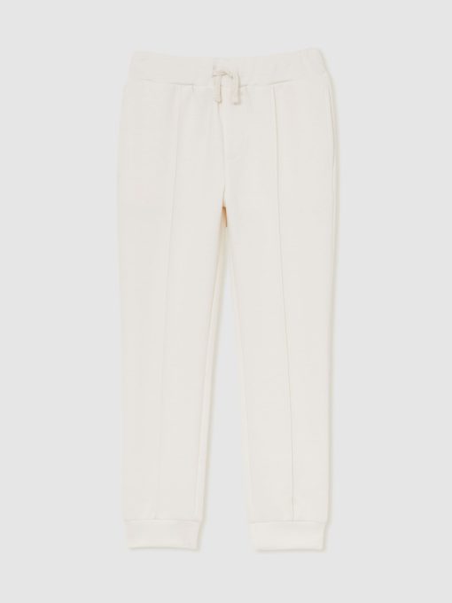 The Off White Premier joggers are a refined take on casual wear. Crafted from smooth interlock jersey, they feature sharp pintucks for a tailored edge. An elasticated drawstring waist and cuffs combine comfort with modern style. Interlock jersey Pintucks Elasticated drawstring waist Side slit pockets Elasticated cuffs