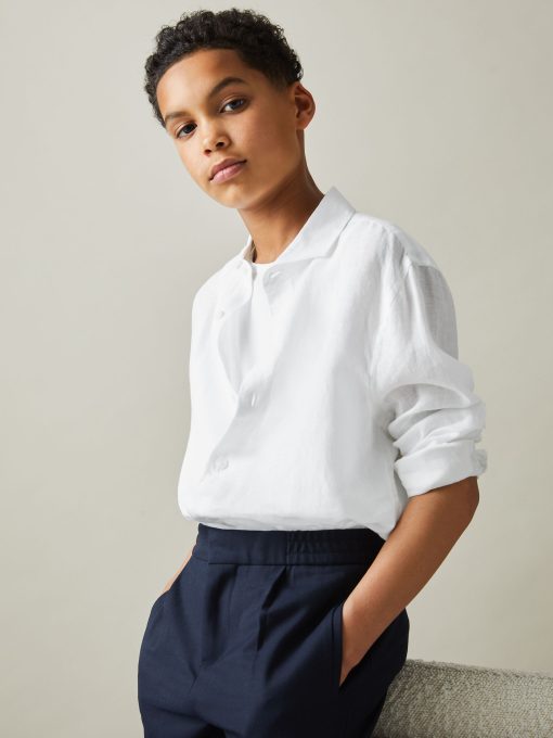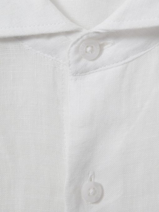 Crafted from lightweight linen with a subtle marl texture, the white Ruban shirt marries comfort with a versatile style. This button-front style is fitted with a cutaway collar and short sleeves. 100% Linen Cutaway collar Button-front closure
