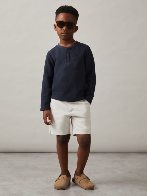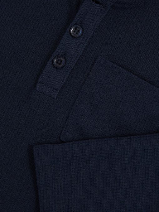 A soft waffle textured lends the Navy David T-Shirt a tactile finish. It’s finished with a classic Henley neckline and long sleeves. Cotton blend Waffle texture Short button placket Chest patch pocket