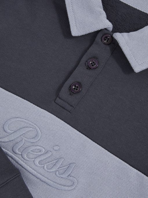 The Airforce Blue/Navy Blue Bryce rugby polo shirt is cut from loopback cotton with a bold contrast panel and an embroidered Reiss logo. A contrasting collar and half-button placket refine the look. 100% Loopback cotton Contrasting panel with embroidered logo Contrasting collar Half-button placket Ribbed cuffs