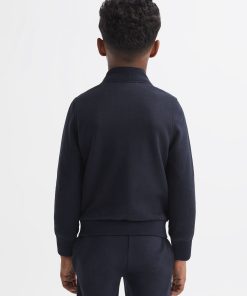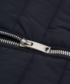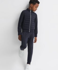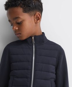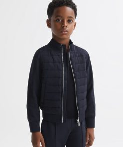 The navy Flintoff jacket is finished with an interlock jersey back and sleeves, a quilted front, and a zip-through fastening with side pockets. It's high funnel-neckline adds style and warmth on colder days. Hybrid knitted-quilted design Funnel neckline Zip-front closure Long sleeves Side-slip pockets The model is wearing a size 5-6 years. Measurements of model: Height 3ft 7″ / 115cm.