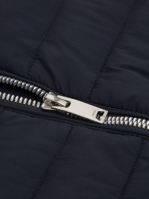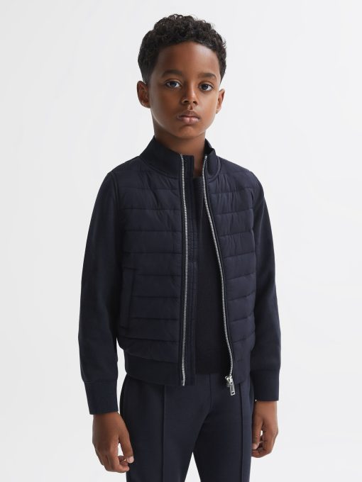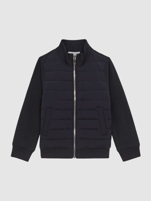 The navy Flintoff jacket is finished with an interlock jersey back and sleeves, a quilted front, and a zip-through fastening with side pockets. It's high funnel-neckline adds style and warmth on colder days. Hybrid knitted-quilted design Funnel neckline Zip-front closure Long sleeves Side-slip pockets The model is wearing a size 5-6 years. Measurements of model: Height 3ft 7″ / 115cm.
