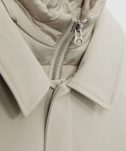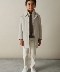 The stone Logan coat layers over a partial gilet that can be removed depending on the weather. It’s crafted from smooth gabardine with a smart spread collar, welt pockets, and tidy concealed press studs. Gabardine Removable partial gilet Welt pockets Concealed front press studs