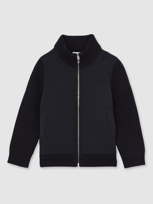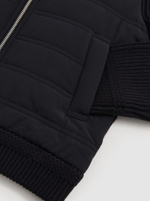The Southend jacket features a lined, quilted front panel and a knitted back panel and arms, lending a sense of warmth and breathability. It’s complete with front zips and ribbed detailing to the neckline and waistband. Hybrid quilt and knit construction Lined front panel Funnel neckline Zip-front closure Ribbed trims Side-slip pockets