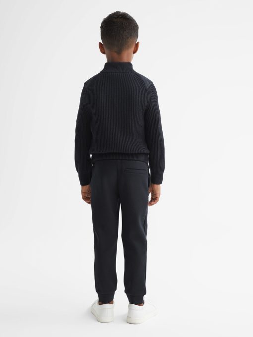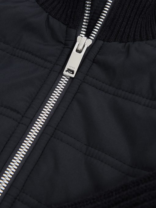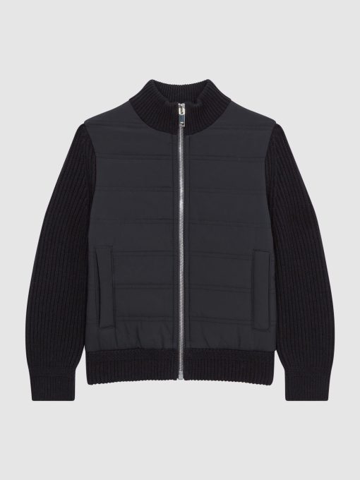 The navy Trainer zip-through marries style with versatile appeal. It’s a hybrid design, fitted with a knitted back panel, arms, and funnel neck, while featuring a quilted shell front panel. The cotton-rich fabrication invites warmth and comfort, making this his go-to for any casual calling. Knitted funnel neckline Quilted front panel Knitted sleeves and back panel Jetted pockets Zip-front closure The model is wearing a size 8.