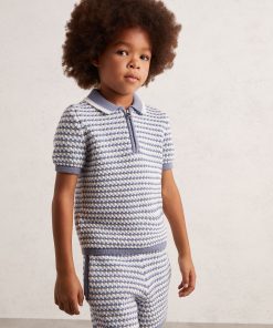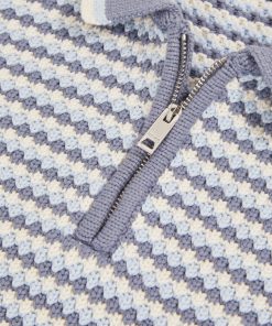 The Keaton polo shirt is crafted in a chunky knit, defined by horizontal alternating stripes that enhance their texture. A half-zip fastening adds a modern touch. Cotton blend. Knitted stripes. Polo collar. Half-zip.