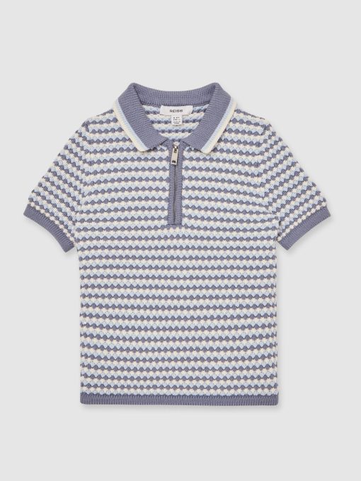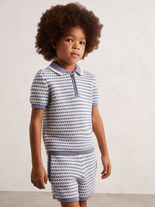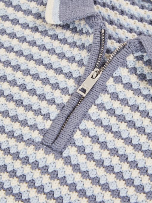 The Keaton polo shirt is crafted in a chunky knit, defined by horizontal alternating stripes that enhance their texture. A half-zip fastening adds a modern touch. Cotton blend. Knitted stripes. Polo collar. Half-zip.