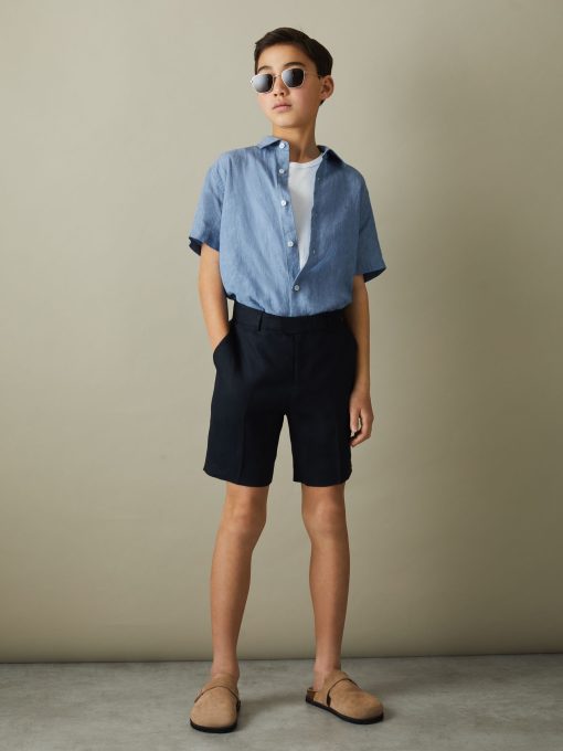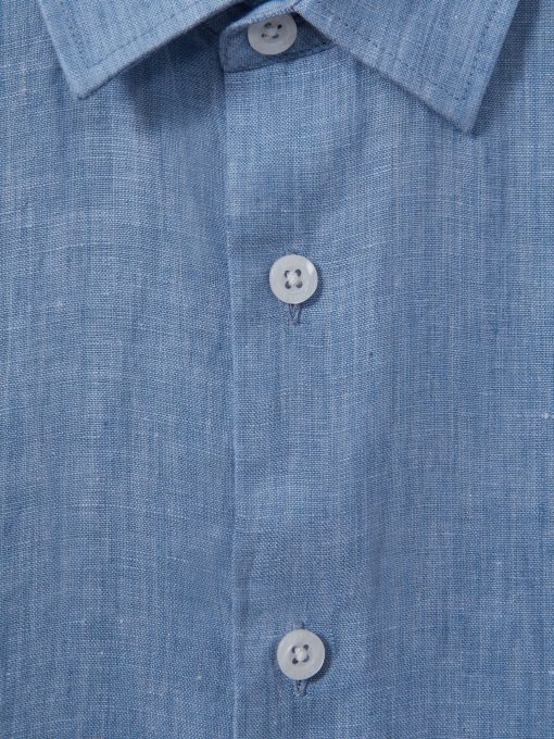 Crafted from lightweight linen with a subtle marl texture, the sky blue Ruban shirt marries comfort with a versatile style. This button-front style is fitted with a cutaway collar and short sleeves. 100% linen Cutaway collar Button-front closure
