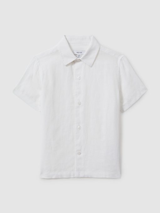 Crafted from lightweight linen with a subtle marl texture, the white Ruban shirt marries comfort with a versatile style. This button-front style is fitted with a cutaway collar and short sleeves. 100% linen Cutaway collar Button-front closure