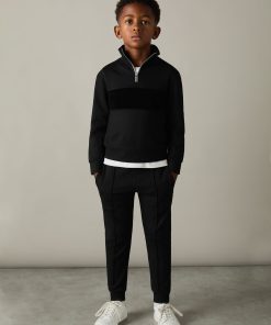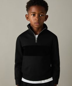 The black Selin jumper updates a classic half-zip funnel neck silhouette with a tactile velour panel to the chest. Lean into this luxe loungewear aesthetic by styling with coordinating joggers. Half-zip funnel neckline Velour panel to chest Long sleeves