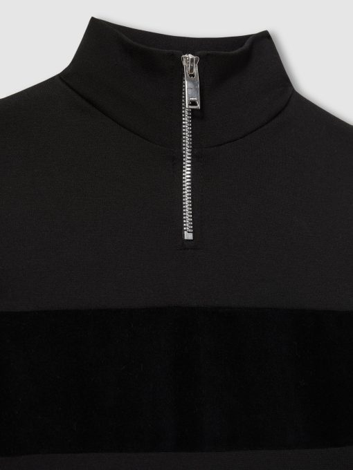 The black Selin jumper updates a classic half-zip funnel neck silhouette with a tactile velour panel to the chest. Lean into this luxe loungewear aesthetic by styling with coordinating joggers. Half-zip funnel neckline Velour panel to chest Long sleeves