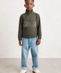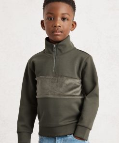 The Dark Sage Green Selin sweatshirt combines soft interlock jersey with plush velour panelling for subtle texture contrast. Featuring a funnel neck and half-zip, it offers a modern, sporty look. Interlock jersey Velour panel Funnel neck Half-zip