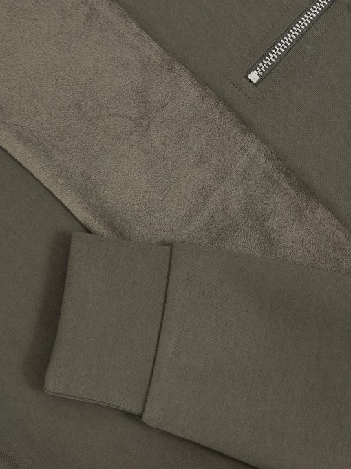 The Dark Sage Green Selin sweatshirt combines soft interlock jersey with plush velour panelling for subtle texture contrast. Featuring a funnel neck and half-zip, it offers a modern, sporty look. Interlock jersey Velour panel Funnel neck Half-zip