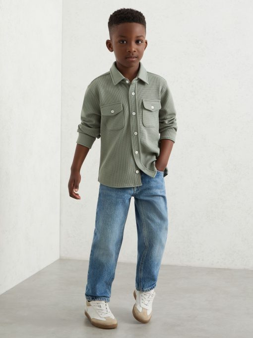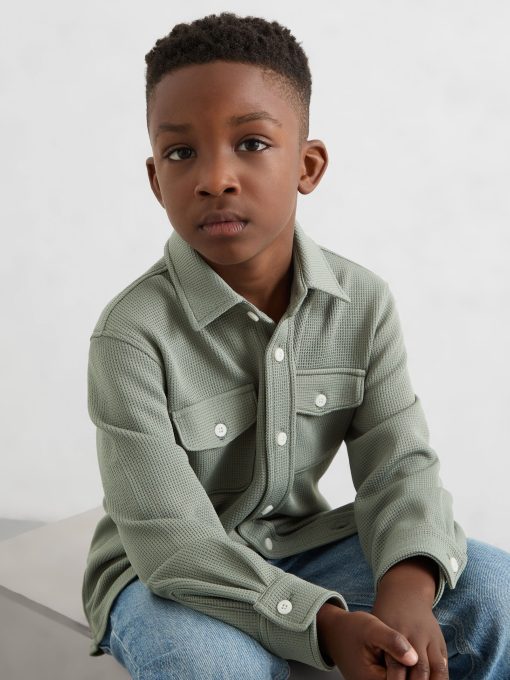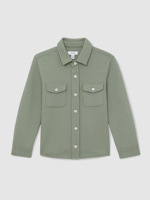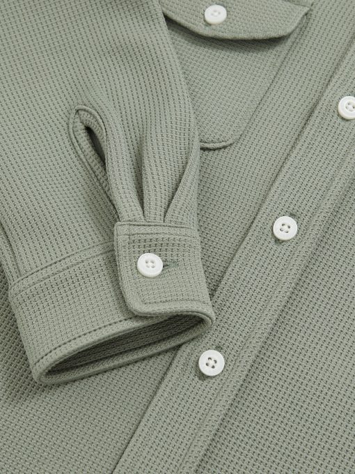 A soft waffle texture gives the Sage Alabastor overshirt a tactile finish, while a classic collar adds refined structure. Buttoned flap pockets introduce a subtle nod to utility. Waffle texture Classic collar Button flap pockets Button cuffs Front button placket