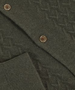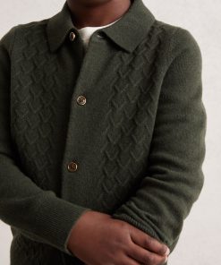 V-stitch cable knitting through the front of the Gideon cardigan lends artisanal appeal. A classic collar offers soft structure to the neckline, while subtly branded buttons add a signature finish. 100% wool. V-stitch cable knit. Classic collar. Front buttons.