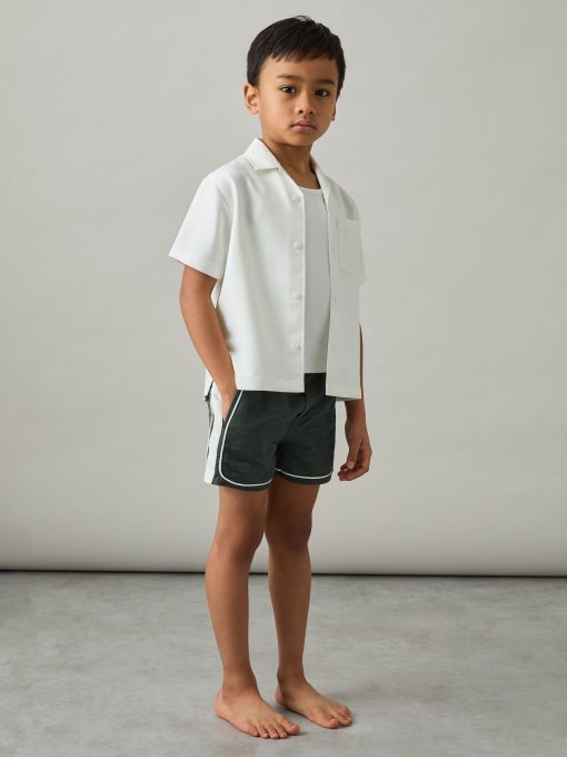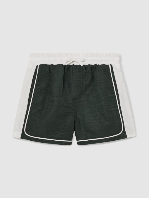 The green/white Cano swim shorts are defined by contrasting panels, accentuated by a piped trim. An elasticated waistband with an adjustable drawstring ensures the perfect fit. Piped trim Elasticated drawstring waistband Side slip pockets Mesh lining