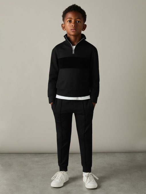 The black Selin sweatshirt updates a classic half-zip funnel-neck silhouette with a tactile velour panel to the chest. Lean into this luxe loungewear aesthetic by styling with the co-ordinating joggers. Half-zip funnel neckline Velour panel to chest Long sleeves