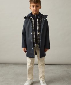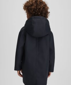 The Navy Eero hooded coat is cut from a water-repellent technical fabric with an ultra-smooth finish. Press-studs fasten the style. Water-repellent technical fabrication Hooded Press-stud front closure Side pockets