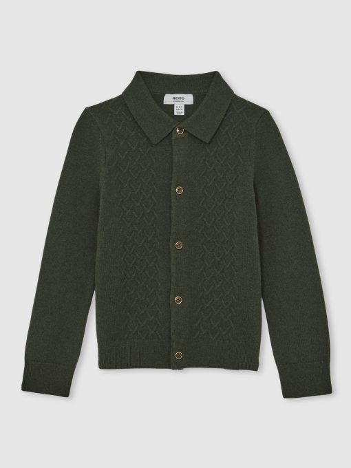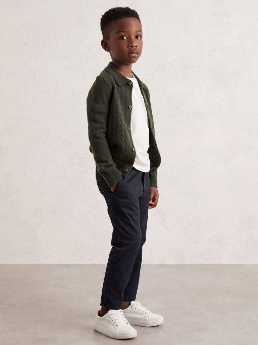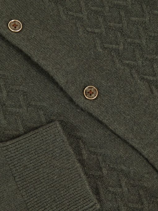 V-stitch cable knitting through the front of the Gideon cardigan lends artisanal appeal. A classic collar offers soft structure to the neckline, while subtly branded buttons add a signature finish. 100% wool. V-stitch cable knit. Classic collar. Front buttons.
