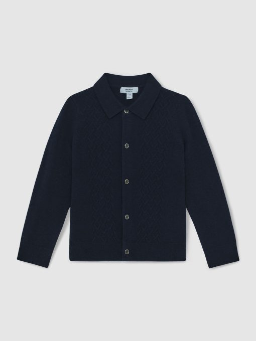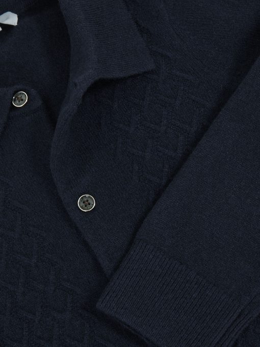 V-stitch cable knitting through the front of the Gideon cardigan lends artisanal appeal. A classic collar offers soft structure to the neckline, while subtly branded buttons add a signature finish. 100% wool. V-stitch cable knit. Classic collar. Front buttons.
