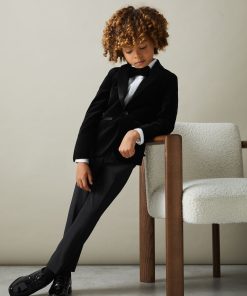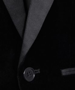 The Ace single-breasted blazer in black is the party piece that will earn sartorial points season after season. It's crafted from a sumptuous velvet fabrication with contrasting satin trims, for a truly timeless look. Style it with a dress shirt, bow tie, tuxedo trousers, and patent shoes for classic evening attire. Single breasted Notch lapels Satin detailing Single-button fastening Long sleeves Buttoned cuffs Jetted pockets Dual vents to reverse The model is wearing a size 5-6 yrs. Measurements of model: Height 3ft 7″ / 115cm.