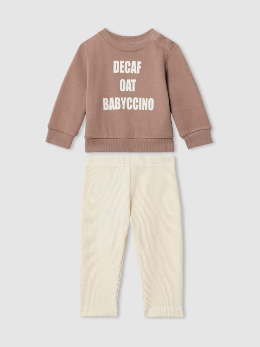 The ivory Ossie set features a cosy sweatshirt paired with waffle-textured leggings, crafted from 100% cotton for ultimate comfort. The sweatshirt is detailed with a playful slogan print and has press-stud shoulder closures for easy dressing. Sweatshirt and waffle leggings set 100% cotton Slogan print Ribbed hem and cuffs Press-stud shoulder closure Welcome little ones into the world and make forever memories with precious pieces for babies, crafted from beautifully soft cotton and the finest cashmere.
