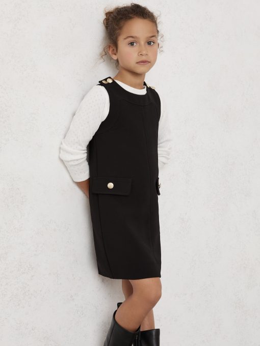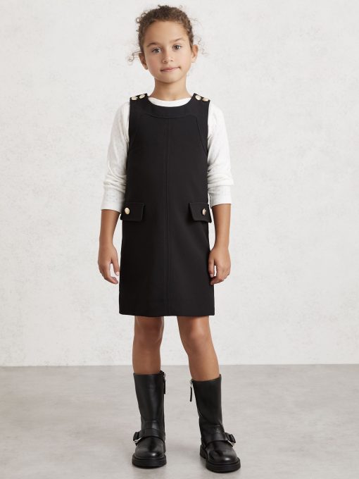 Crest-embossed buttons at the shoulder give the Cyrus shift dress a subtle pinafore feel, while buttoned pocket flaps add a charming finish. It's sleeveless shape makes it ideal for effortless layering. Crest-embossed buttons. Crew neckline. Sleeveless. Button pocket flaps.