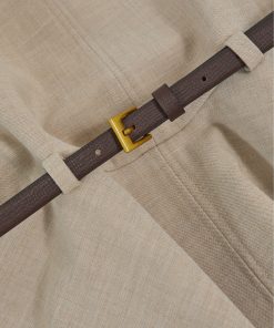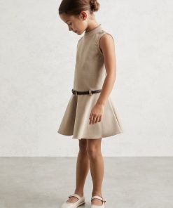 The Neutral Bella dress is shaped to a high-neck, sleeveless silhouette with a dropped waist and flared, flippy skirt. A faux-leather belt defines the waist, while the woven crosshatch fabric lends subtle depth to the design. Mock neckline Sleeveless Faux-leather belt Flared skirt Buttons and concealed zip to reverse
