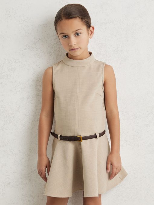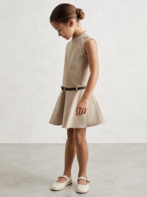 The Neutral Bella dress is shaped to a high-neck, sleeveless silhouette with a dropped waist and flared, flippy skirt. A faux-leather belt defines the waist, while the woven crosshatch fabric lends subtle depth to the design. Mock neckline Sleeveless Faux-leather belt Flared skirt Buttons and concealed zip to reverse