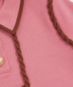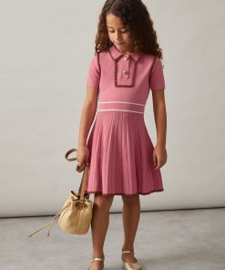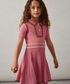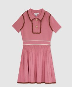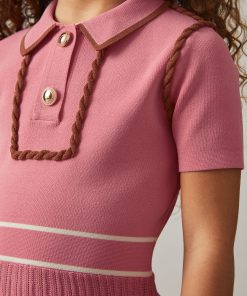 Twisted piping around the armholes and front placket brings a charming twist to the Freeda knitted dress. Ribbed pleating adds graceful movement to the flared skirt, while decorative buttons at the placket lend a vintage-inspired finish. Compact knit with stretch Twisted piping Classic collar with contrast edge Pleated rib skirt Placket with decorative buttons