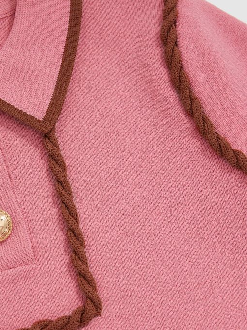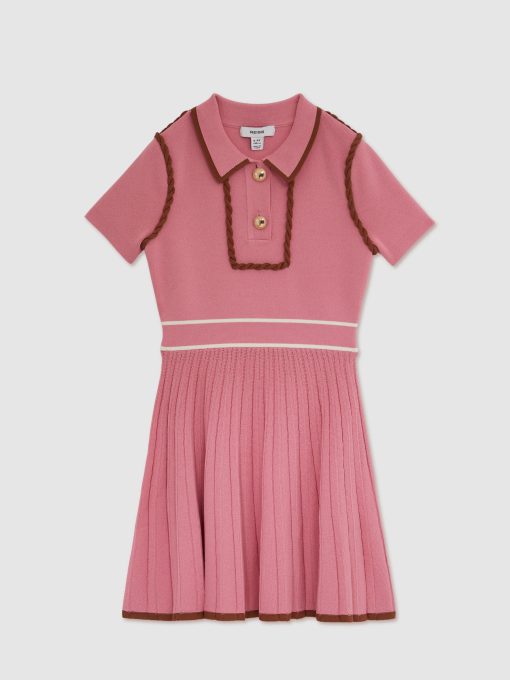 Twisted piping around the armholes and front placket brings a charming twist to the Freeda knitted dress. Ribbed pleating adds graceful movement to the flared skirt, while decorative buttons at the placket lend a vintage-inspired finish. Compact knit with stretch Twisted piping Classic collar with contrast edge Pleated rib skirt Placket with decorative buttons