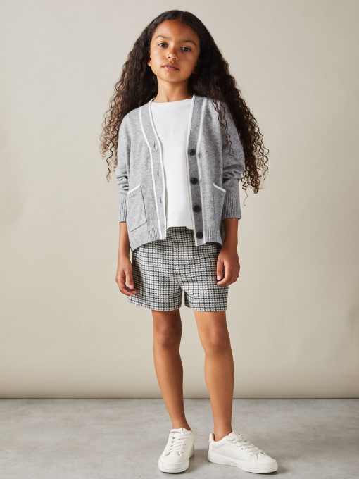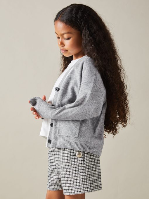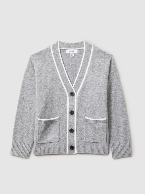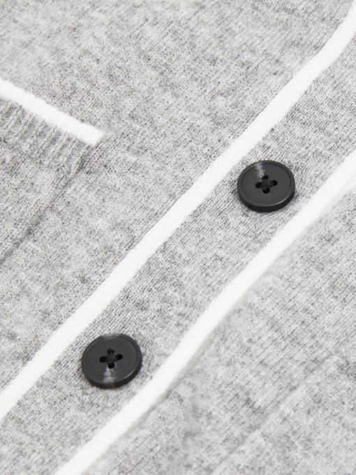 Fine wool yarns are mixed with cashmere for the Grey Juni button-through cardigan, ensuring ultimate comfort and breathability. Its relaxed fit is perfect for layering over T-Shirts and roll necks alike. Wool-cashmere blend Button-front closure Patch pockets Ribbed trims Contrast tips Fashioning seam to reverse Relaxed fit