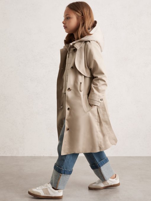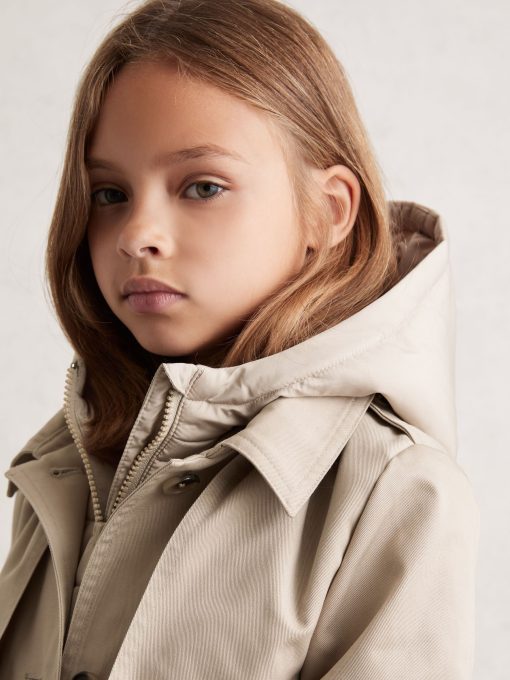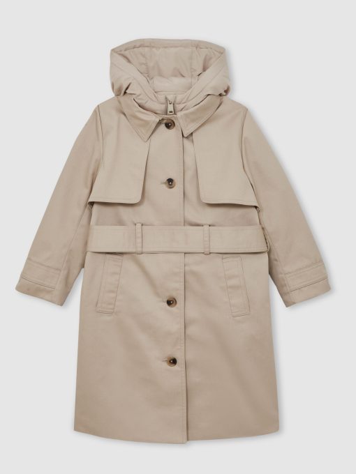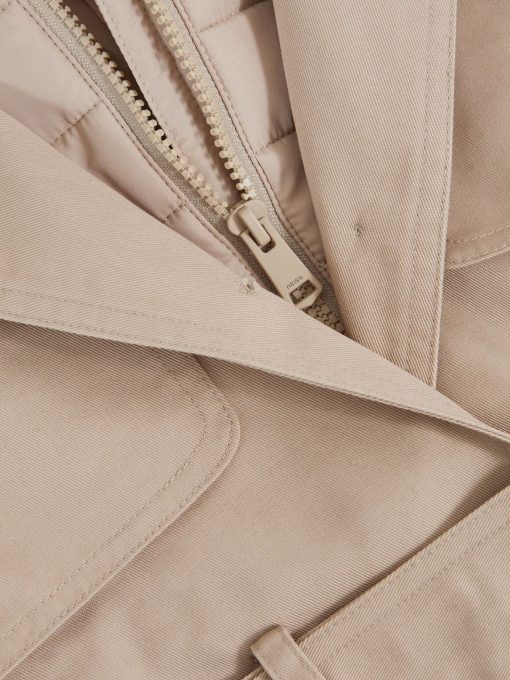 A modern take on classic outerwear, the Astrid trench coat features a removable padded gilet insert with a hood for additional warmth. Storm flaps, side welt pockets, and a self-tie belt complete its functional, refined design.Crafted with cottonRemovable padded insert with hoodStorm flapsSelf-tie beltFront buttons