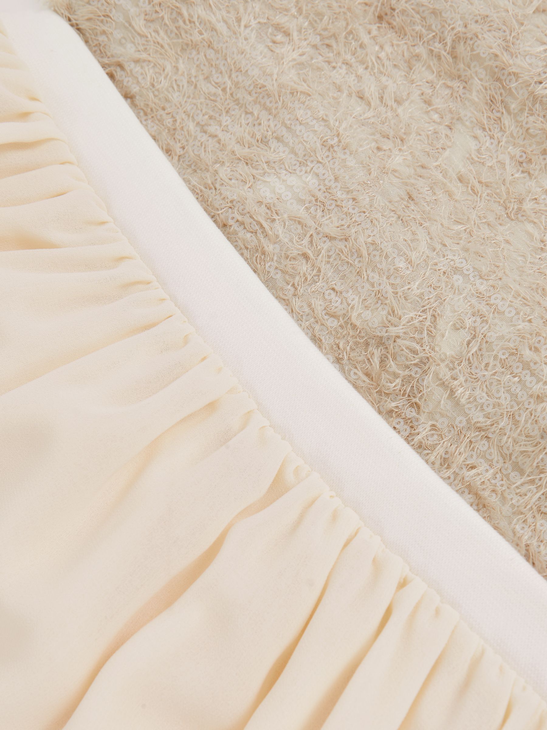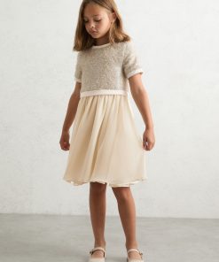The Bee dress pairs subtle texture with soft movement for a playful occasionwear look. Sparkling sequins and faux fur detailing elevate the short-sleeved bodice, while a lightweight chiffon skirt falls to a flared hem for gentle volume. Sequin embellishment, Faux fur detailing, Crew neckline, Fastening to reverse Chiffon skirt.