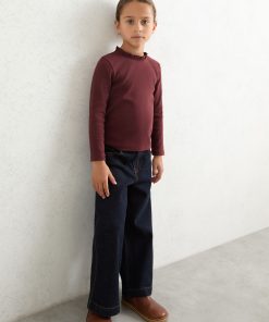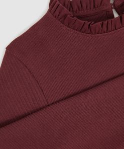 The Burgundy Flora top is crafted from fine-ribbed cotton jersey with added stretch, offering a close, comfortable fit. Its classic crew neckline is trimmed with a delicate ruffle for a charming finish. Cotton with stretch Ruffle neck trim Long sleeves Button keyhole to reverse