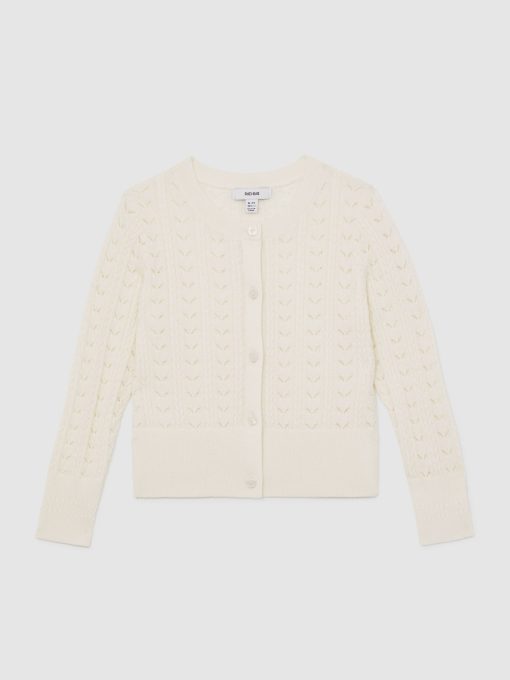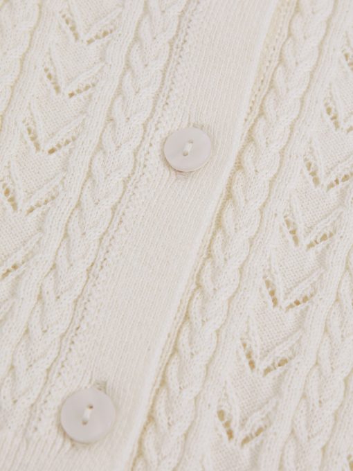 The Flo cardigan is a lightweight layer knitted from a breathable cotton and wool blend, ideal for year-round wear. Its intricate mix of cable and pointelle stitching adds delicate texture, while ribbed trims complete the look with a refined finish. Cotton and wool blend Cable and pointelle knit Crew neckline Ribbed trims Front buttons