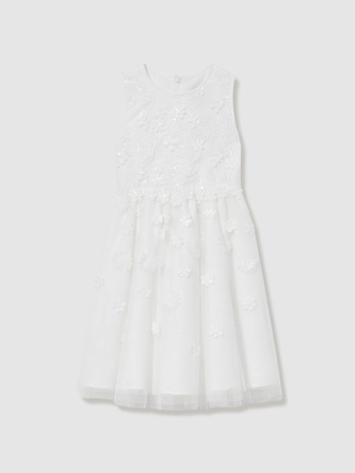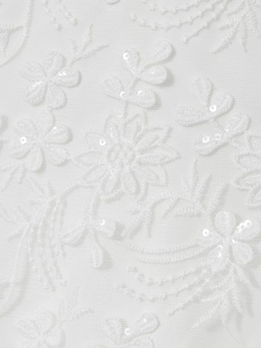 The Clementine bridesmaid dress is crafted with a lightweight tulle overlay that’s embroidered with delicate flowers and tonal sequins. Multiple layers create a flared, princess-style skirt that offers just the right amount of volume. Tulle overlay Floral embroidery Sequins Layered Skirt Lined Concealed zip to reverse