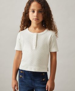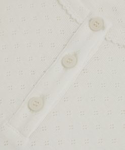 The Margot T-Shirt is crafted from 100% Cotton in a delicate pointelle knit. A short button placket and picot-trimmed sleeves add subtle vintage-inspired detail, while a crew neckline keeps the look classic. 100% Cotton Pointelle knit Crew neckline Short sleeves with picot trim Short button placket