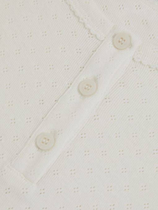 The Margot T-Shirt is crafted from 100% Cotton in a delicate pointelle knit. A short button placket and picot-trimmed sleeves add subtle vintage-inspired detail, while a crew neckline keeps the look classic. 100% Cotton Pointelle knit Crew neckline Short sleeves with picot trim Short button placket