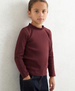 The Burgundy Flora top is crafted from fine-ribbed cotton jersey with added stretch, offering a close, comfortable fit. Its classic crew neckline is trimmed with a delicate ruffle for a charming finish. Cotton with stretch Ruffle neck trim Long sleeves Button keyhole to reverse