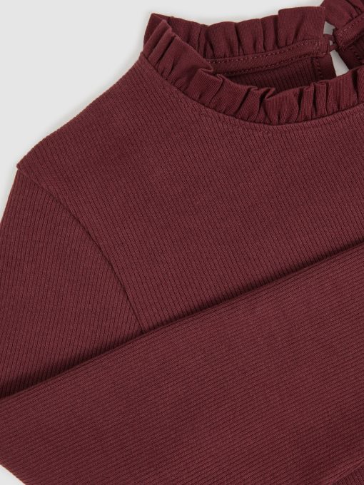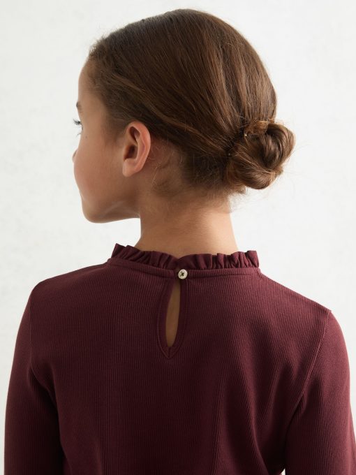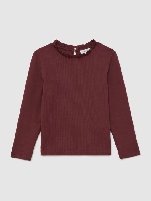 The Burgundy Flora top is crafted from fine-ribbed cotton jersey with added stretch, offering a close, comfortable fit. Its classic crew neckline is trimmed with a delicate ruffle for a charming finish. Cotton with stretch Ruffle neck trim Long sleeves Button keyhole to reverse