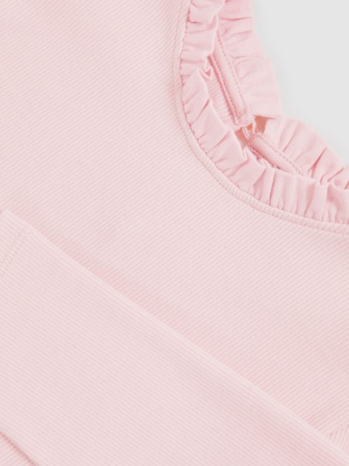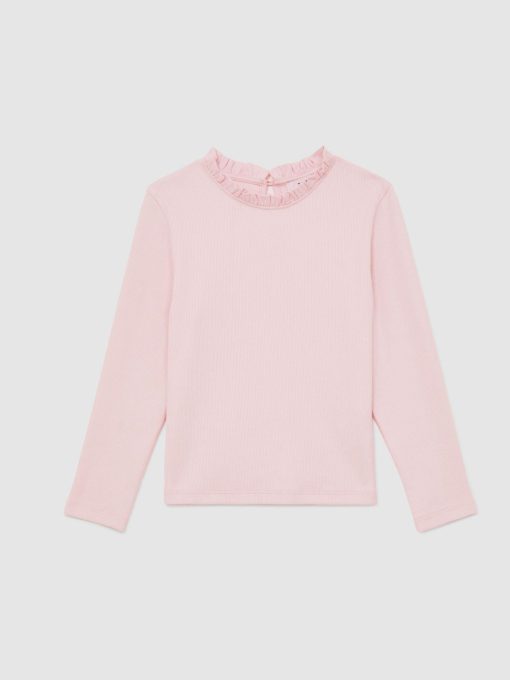 The Pink Flora top is crafted from fine-ribbed cotton jersey with added stretch, offering a close, comfortable fit. Its classic crew neckline is trimmed with a delicate ruffle for a charming finish. Cotton with stretch Ruffle neck trim Long sleeves Button keyhole to reverse