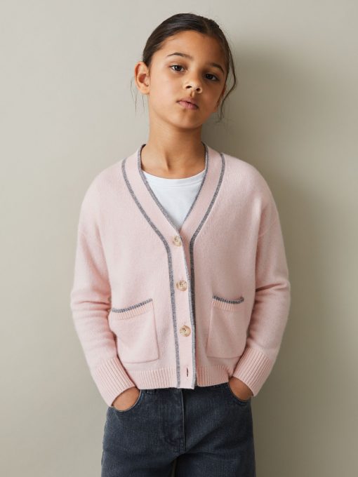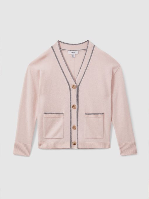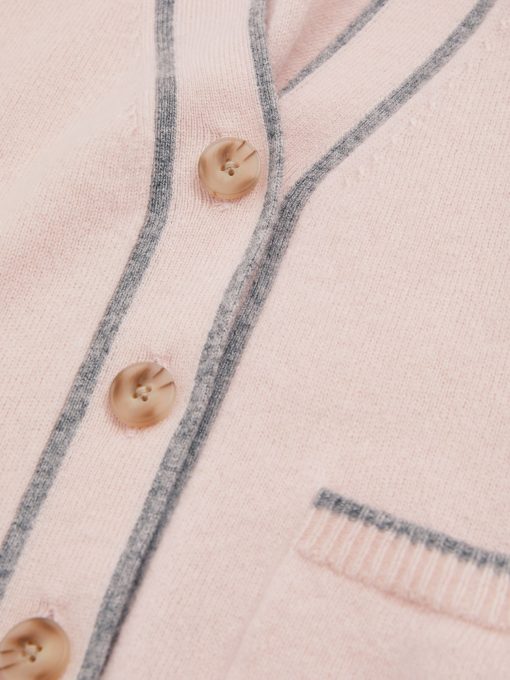 Fine wool yarns are mixed with cashmere for the Pink Juni button-through cardigan, ensuring ultimate comfort and breathability. Its relaxed fit is perfect for layering over T-Shirts and roll necks alike. Wool-cashmere blend Button-front closure Patch pockets Ribbed trims Contrast tips Fashioning seams to reverse Relaxed fit